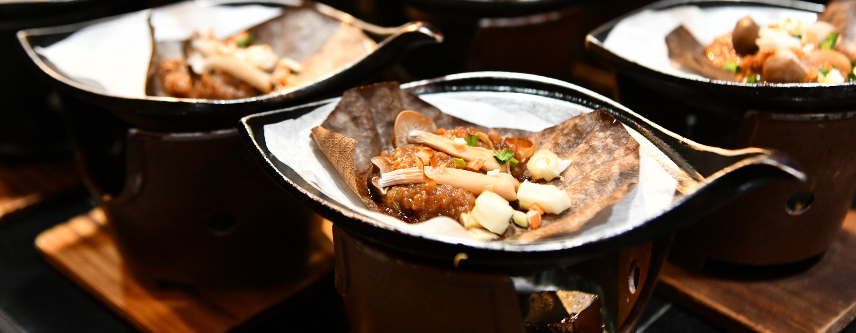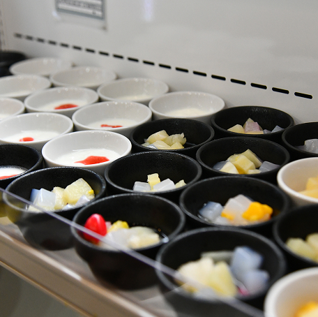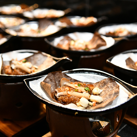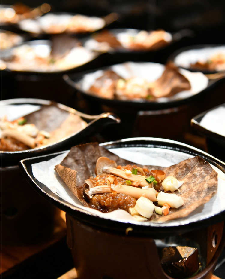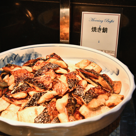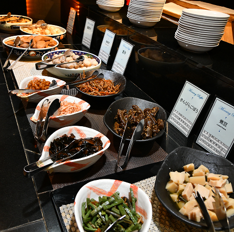 ⾶騨名物「朴葉味噌」や「鶏ちゃん」、椎茸昆布煮や漬物など、地元の味もラインナップ。30種以上から⾃由に選んで、⾃分だけの朝⾷スタイルをお楽しみください。