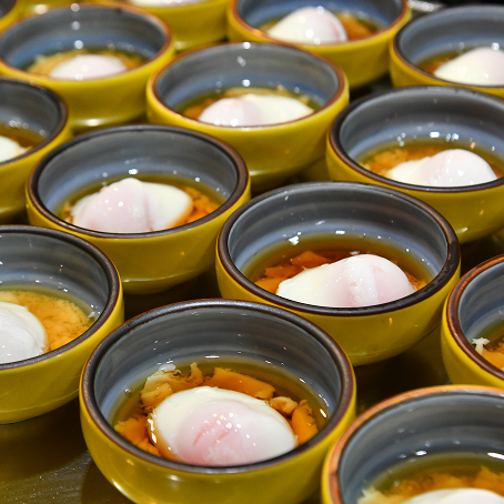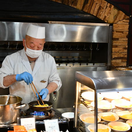 ⽬の前で仕上げるふわふわオムレツや、焼き⿂・ベーコン・温泉⽟⼦などの定番料理。和洋のバリエーションに加え、点⼼や煮物など、⼼もお腹も満たすメニューを揃えました。